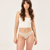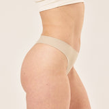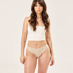 Coffee: Our Zero Cheeky Slips G Sting is made from recycled coffee beans(67% Nylon 33% Spandex) that is breathable, sweat wicking, cooling, and odour resistant. It includes a bamboo gusset infused with mint fiber to maintain a cooling effect.